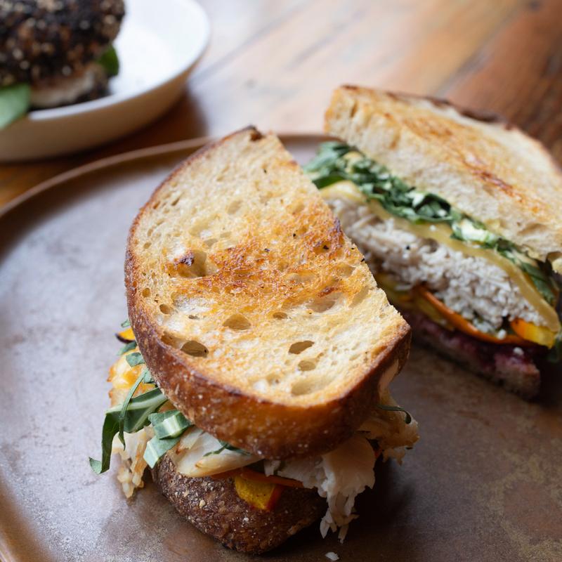 Roasted Turkey, Pickled Jalepenos, Bacon, Goud, Chipotle Sauce, Fresh Collards, on Sourdough